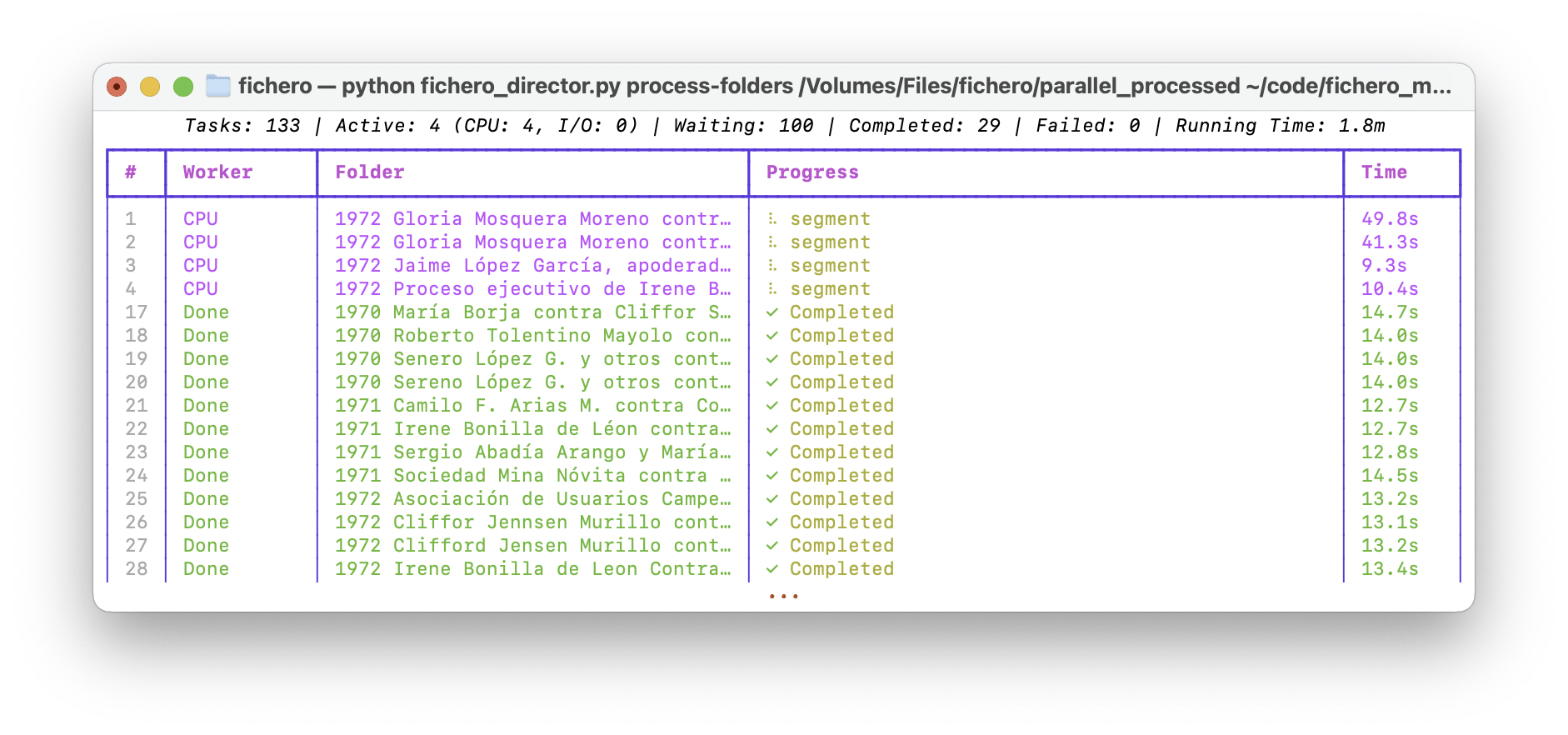 This week, I got fichero_director.py working, which uses Celery to run Fichero “workers” on multiple processes, each doing different steps at the same time.