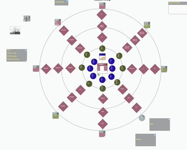 Doing that, forcing my self to slow down, was enough to let us sketch out the “spokes” or “radial threads” of a castnet. There are eight. These are probably going to feel very much like chapters. In the centre, there’s the Reader’s Guide. Outside that, on the first rung, we have the crisis on the linoleum, that will fead into the 8 chapters. It will be an interlude between each chapter. Then we have the threads: First and Second Fieldwork, Time and Money, Tools, Rules, Fichero, Bricolage, Makeshift, and Ambulatory Anthropology. Each thread has related scenes and arguments. Acknowledgements will come at the end.